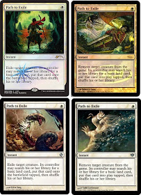 What made this card rather handy is that one could Path to Exile on your own creature to serve as a passable mana-fixer were you in a crunch.  PtE also ignited a good deal of debate as to which was better - Path to Exile OR Swords to Plowshares.  With Path, the downside was giving your opponent an extra land where Swords provided the controller of the exiled creature life gain equal to the exiled creature's power.  We never really did take any sides of this argument as the game state situation dictated which card proved better.  So popular is Path to Exile, WotC printed this in Modern Event Deck, Modern Masters, Duel Decks, Commander, Archenemy, and originally in Conflux (Shards of Alara block).